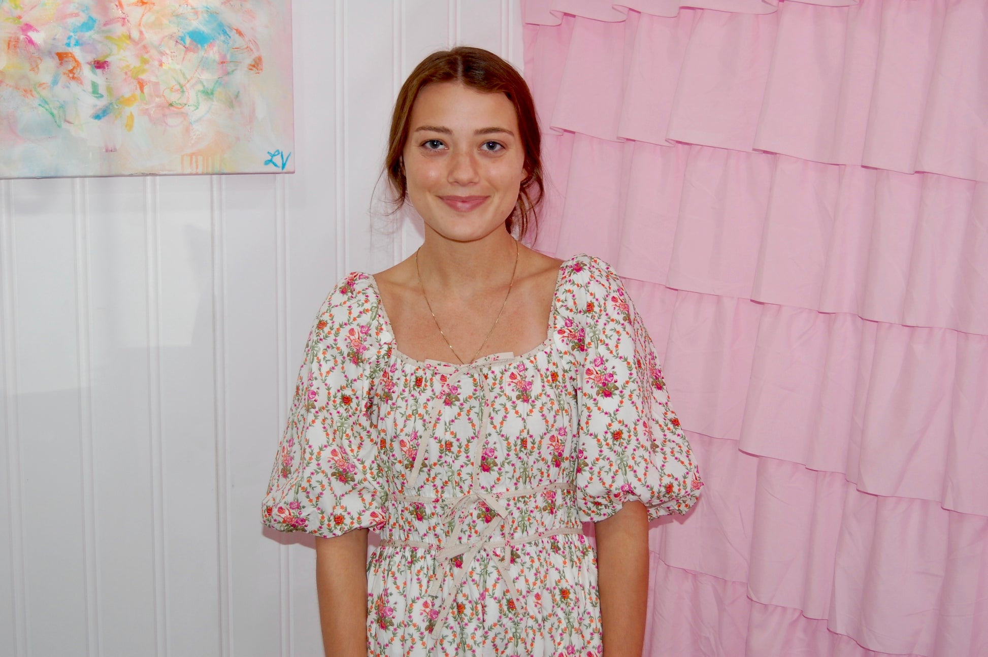 Off-White Poplin Maxi Dress with Floral Details & Puff Sleeve - 'Sabrina Dress'